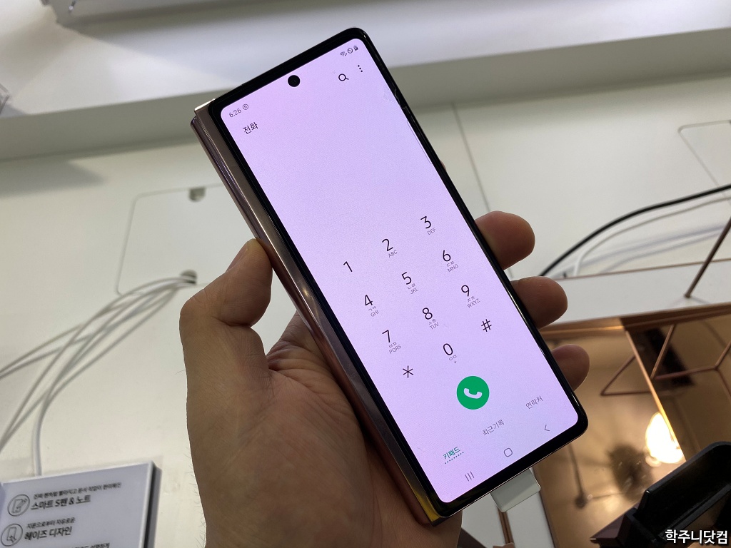 갤럭시Z폴드2 커버 디스플레이에서의 전화기 어플리케이션 폴드2의 커버 디스플레이에 대해서 많은 이야기를 하고 있는데 위의 사진을 보면 왜 그런 이야기를 하는지 알 수 있다. 폴드에서도 커버 디스플레이를 통해서 전화를 충분히 할 수 있는데 4.6인치다보니 위, 아래로 생기는 레터박스로 인해 조금은 답답해 보이는 감이 없지않아 있었다.