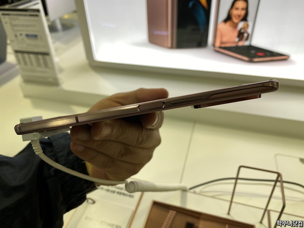 갤럭시Z폴드2 펼친 상태에서의 밑면 폴드2의 두께는 6.9mm로 상당히 얇은 편이다. 하기사 접었을 때를 고려해야 하니 펼쳤을 때 최대한 얇게 만들어서 접었을 때의 두께가 어느정도는 잡힐 수 있는 수준으로 되어야 하기 때문에 얇게 만들었을 것이라 생각이 든다.