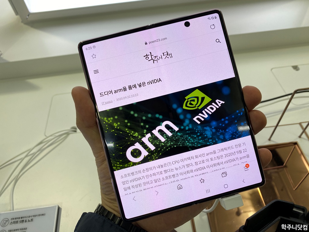 갤럭시Z폴드2 펼친 상태에서의 메인 디스플레이(웹브라우징) 메인 디스플레이에서 웹브라우저를 실행시켜봤다. 우측 상단의 펀치홀이 조금 눈에 거슬릴 수 있지만 그래도 인디케이터 부분에 있기 때문에 실제 컨텐츠의 내용을 가리지 않아서 나쁘지 않았다(다만 조금 홀의 크기가 작았으면 하는 생각은 있다).