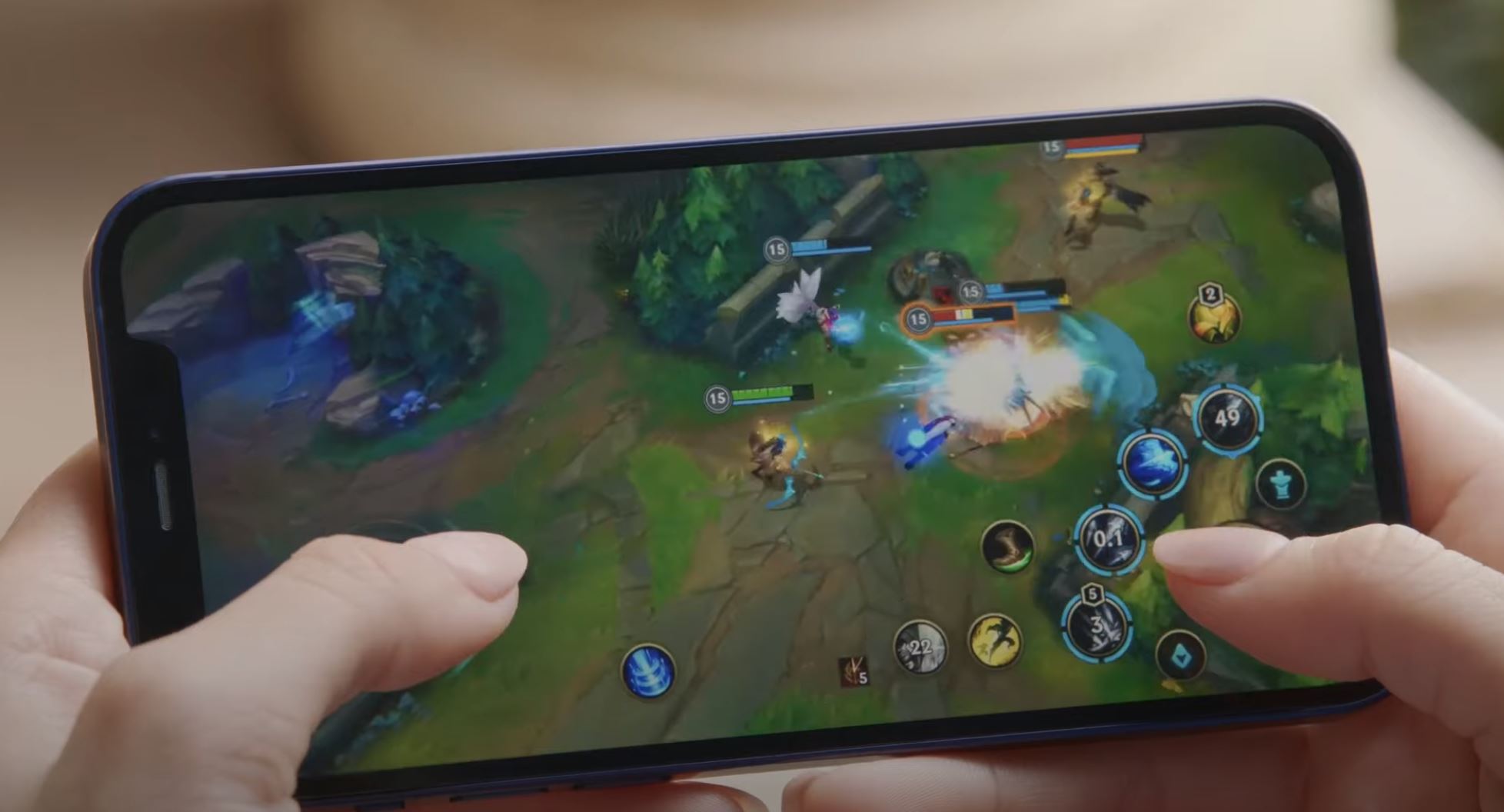 아이폰12에 A14 바이오닉 칩셋이 들어감으로 인해 성능 향상이 있었고 그로 인해 게임 지원도 더 빵빵해졌다는 얘기를 했는데 대상으로 보여준 것이 League of Legends(LOL) Wild Rift 게임이었다. 모바일에서 LOL을 즐길 수 있게 된 것이다.