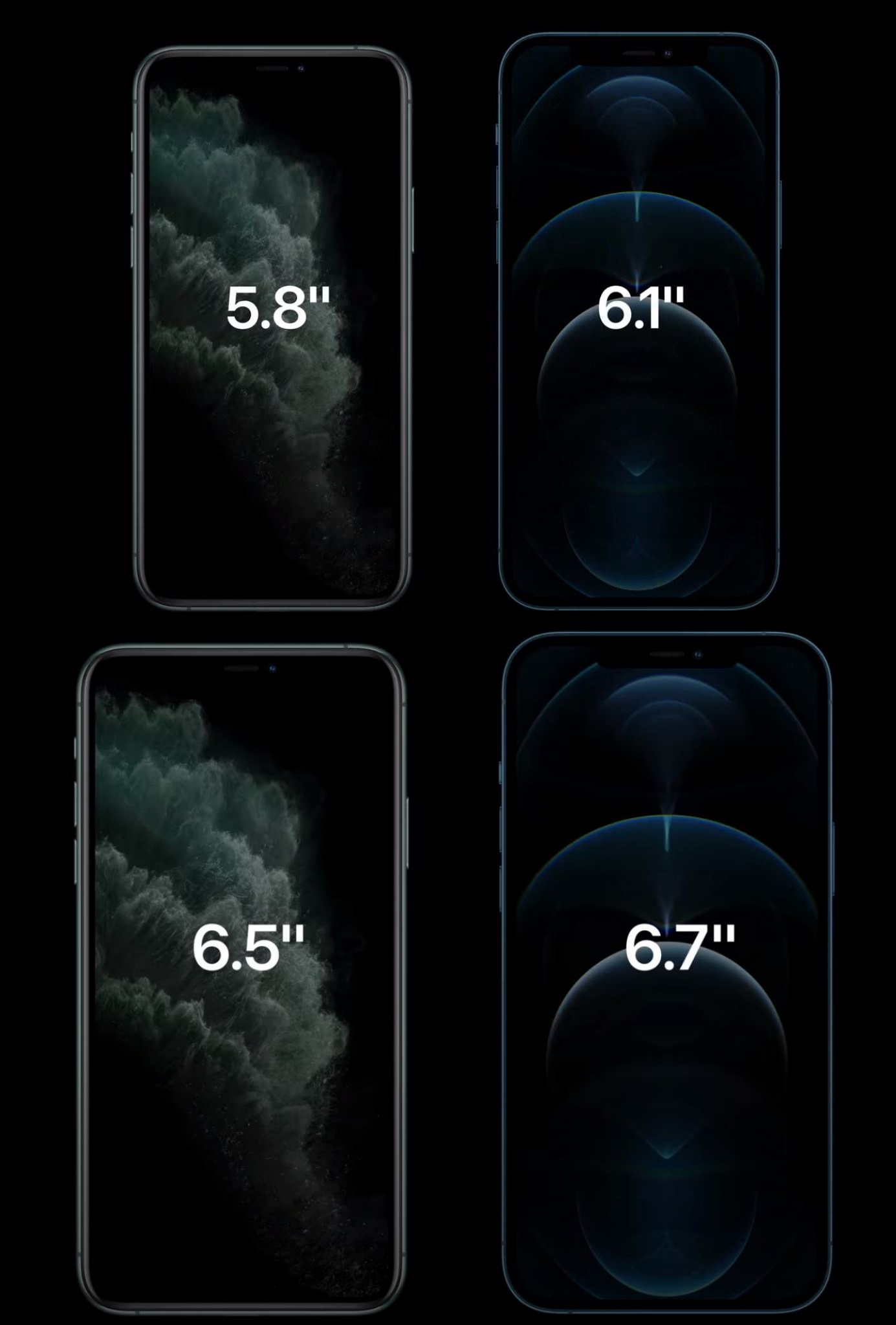 다만 디스플레이의 크기가 달라졌는데 이전의 아이폰11프로 시리즈는 프로의 경우 5.7인치, 프로 맥스는 6.5인치였는데 아이폰12프로 시리즈의 경우 프로는 아이폰11과 동일한 6.1인치, 프로 맥스는 6.7인치로 지금까지 나온 아이폰들 중 가장 큰 디스플레이를 지닌 아이폰으로 나오게 되었다.