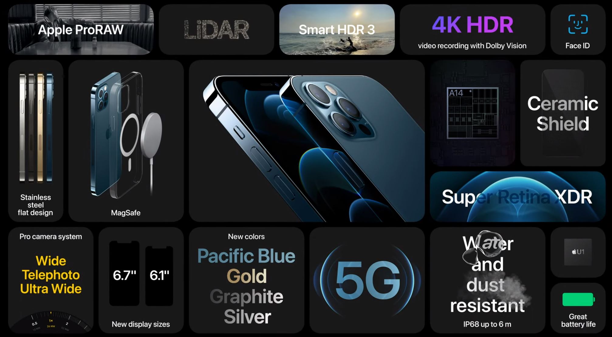 아이폰12프로는 6.1인치, 아이폰12프로 맥스는 6.7인치의 슈퍼 레티나 XDR 디스플레이를 탑재해서 나오게 되며 아이폰12 시리즈와 마찬가지로 충격 방지를 위해 세라믹 실드를 적용했다. 또한 아이폰12 시리즈와 마찬가지로 IP68 등급의 방수방진 기능을 제공하며 맥세이프 기능 역시 추가되었다.
