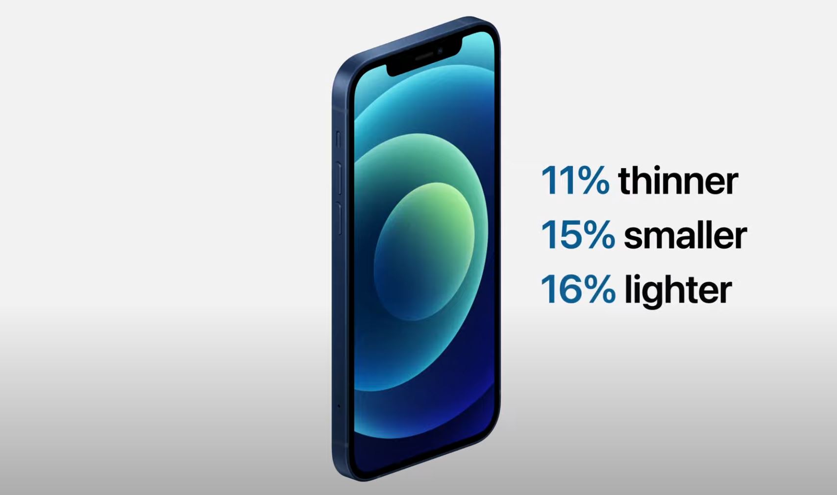 아이폰12는 6.1인치로 제공된다(밑에서 또 다른 아이폰12가 나오지만 그건 밑에서 확인하면 될 듯). 그런데 크기 자체는 이전 모델인 아이폰11보다 11% 얇아졌고 15% 작아졌으며 16% 가벼워졌다. 애플 홈페이지에서 제공하는 아이폰12의 두께는 7.4mm, 가로는 71.5mm, 세로는 146.7mm이며 무게는 162g이다.
