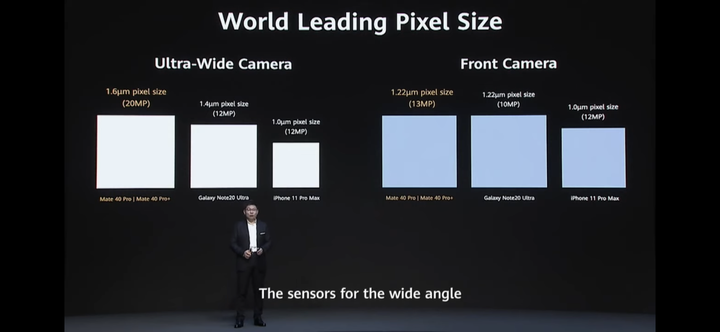 마찬가지로 비교를 했는데 갤럭시 노트 20 울트라의 경우 1/1.33인치, 아이폰12 프로맥스는 1/2.55인치라고 하니 자기네 메이트 40 시리즈에 들어간 1/1.28인치 센서가 얼마나 큰지 자랑할만 하다.