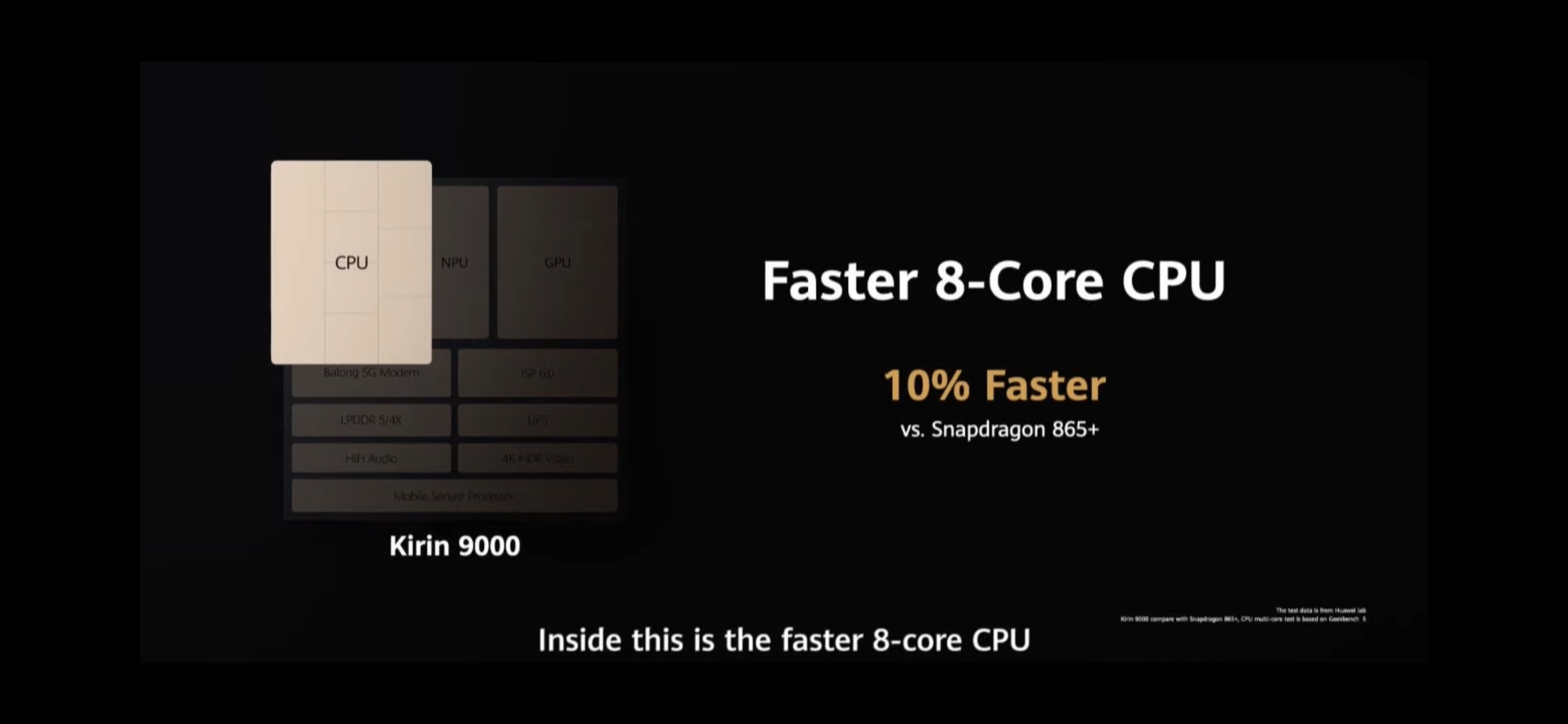 뭐, 기린 9000 칩셋은 화웨이 얘기로 현존하는 ARM 기반 모바일 AP 중에서 최고의 성능을 지닌 5G 지원 AP라는 얘기를 하고 있다. 마지막 장표에서 보여줬던 트랜지스터가 무려 153억개가 들어갔다고 하니 말이다. CPU 속도는 3.13GHz를 제공하고 말이다.