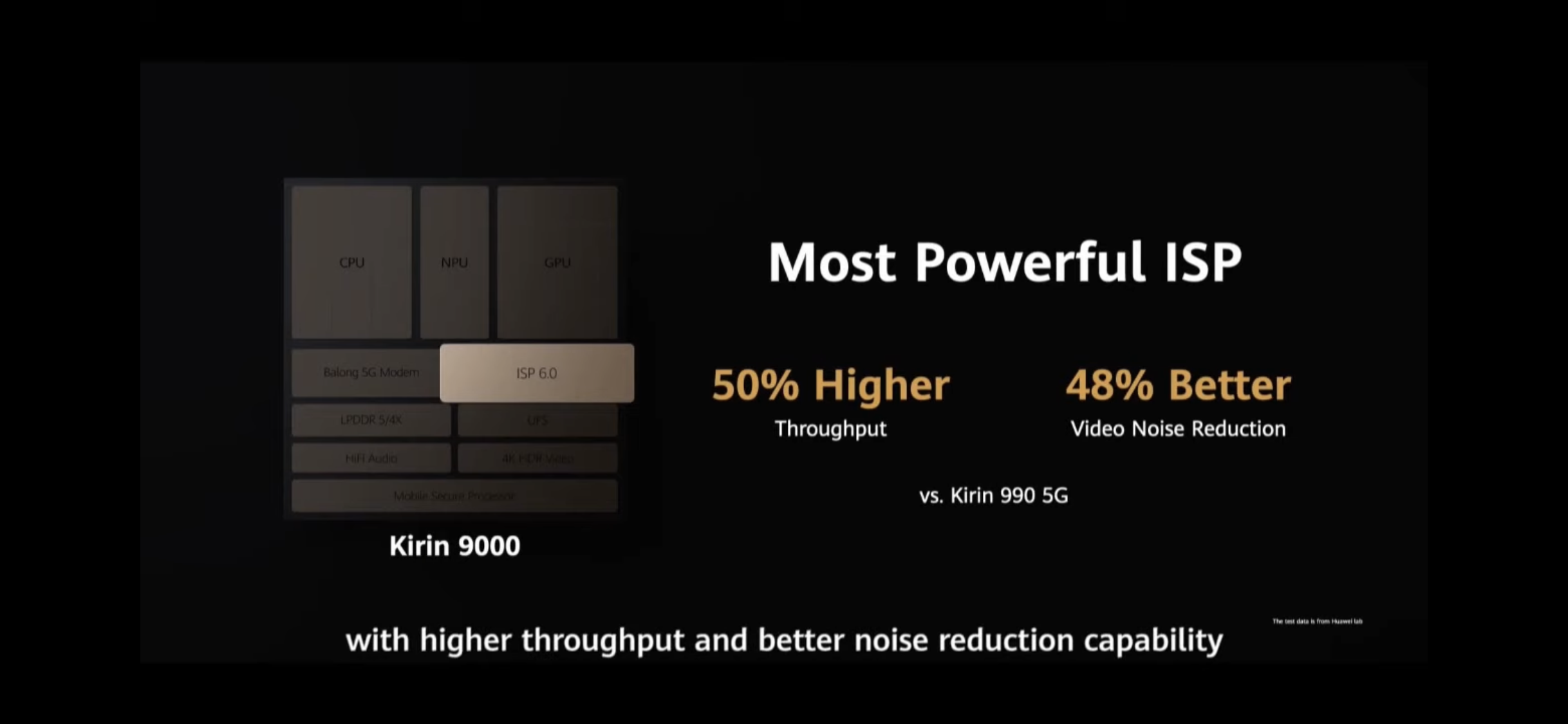 요즘들어 스마트폰의 카메라 성능, 이미지 처리 기술이 어떤 의미에서 스마트폰의 핵심 기능으로 분류되고 있으며 그 가운데에는 이미지 처리 프로세스, 즉 ISP의 성능이 중요하게 여겨지고 있다. 그런 의미에서 기린 9000은 기존 기린 990 대비 50% 더 향상되었고 노이즈 제거 효과도 48% 더 좋아졌다고 한다.