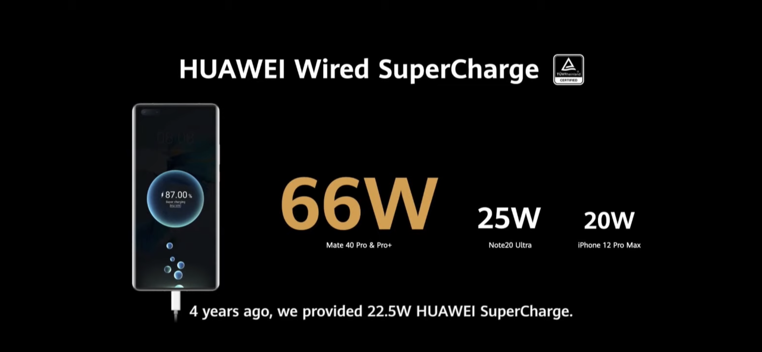 고속 충전에 대한 부분도 언급을 했는데 메이트 40 프로 시리즈의 경우 유선 충전으로 고속 충전을 무려 66W를 제공한다는 것이다. 이건 뭐 거의 노트북 급 파워를 끌어온다는 얘기다. 비교군으로 갤럭시 노트 20 울트라는 25W, 아이폰12 프로맥스는 20W의 고속 충전을 제공한다.