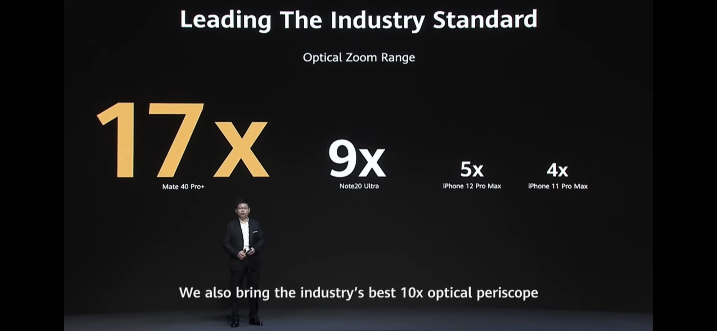 화웨이의 경우 메이트 40 프로+에 들어가있는 잠망경 스타일의 망원 렌즈에서 제공하는 광학 10배줌이 세계에서 가장 우수한 광학 10배줌이라고 얘기하고 있다. 하이브리드 광학 줌으로는 20배줌, 디지탈 줌으로는 최대 100배줌까지 제공한다.