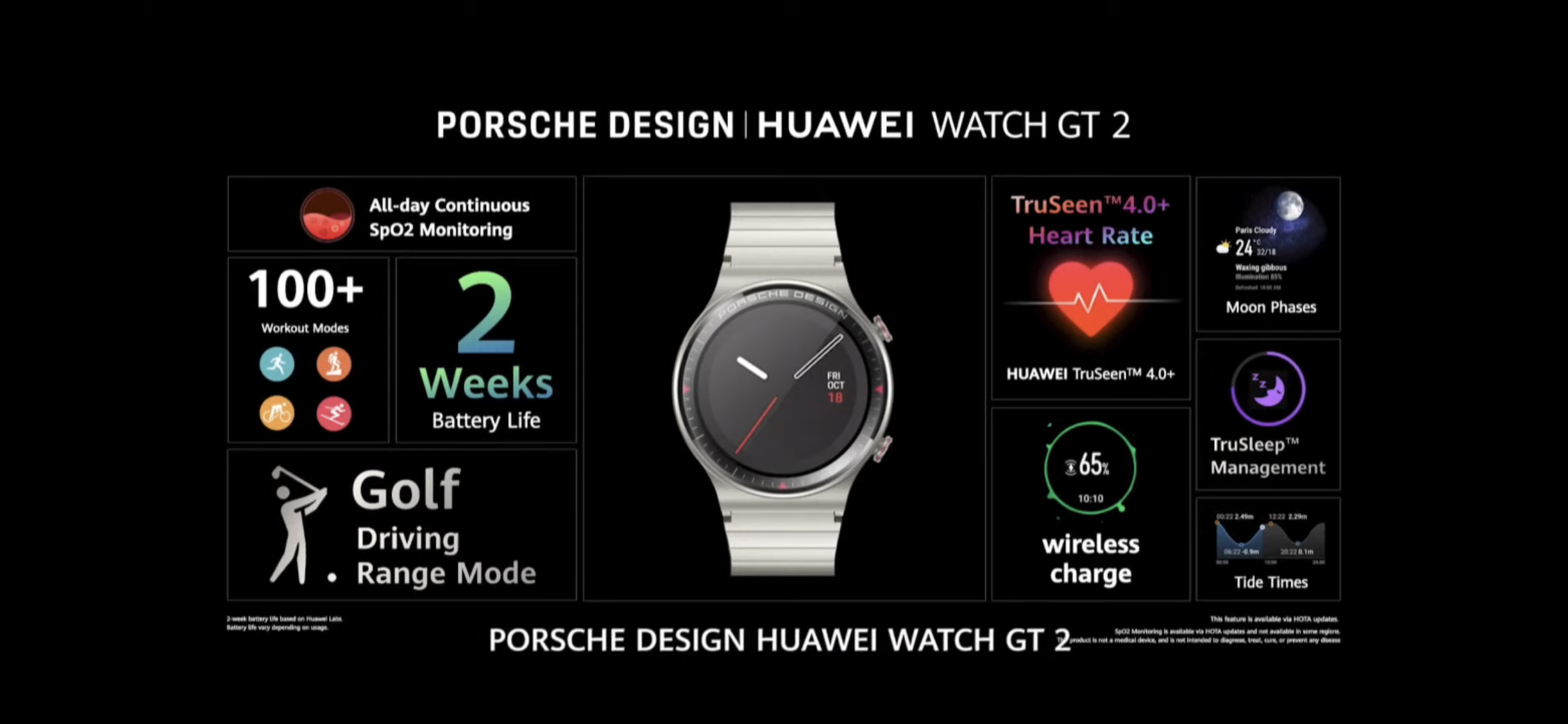 포르셰 디자인을 적용한 화웨이워치 GT 2는 배터리 타임이 2주정도이고 무선 충전이 가능하며 골프 동작 모드를 제공하고 100개 이상의 운동 기능을 제공한다고 한다.