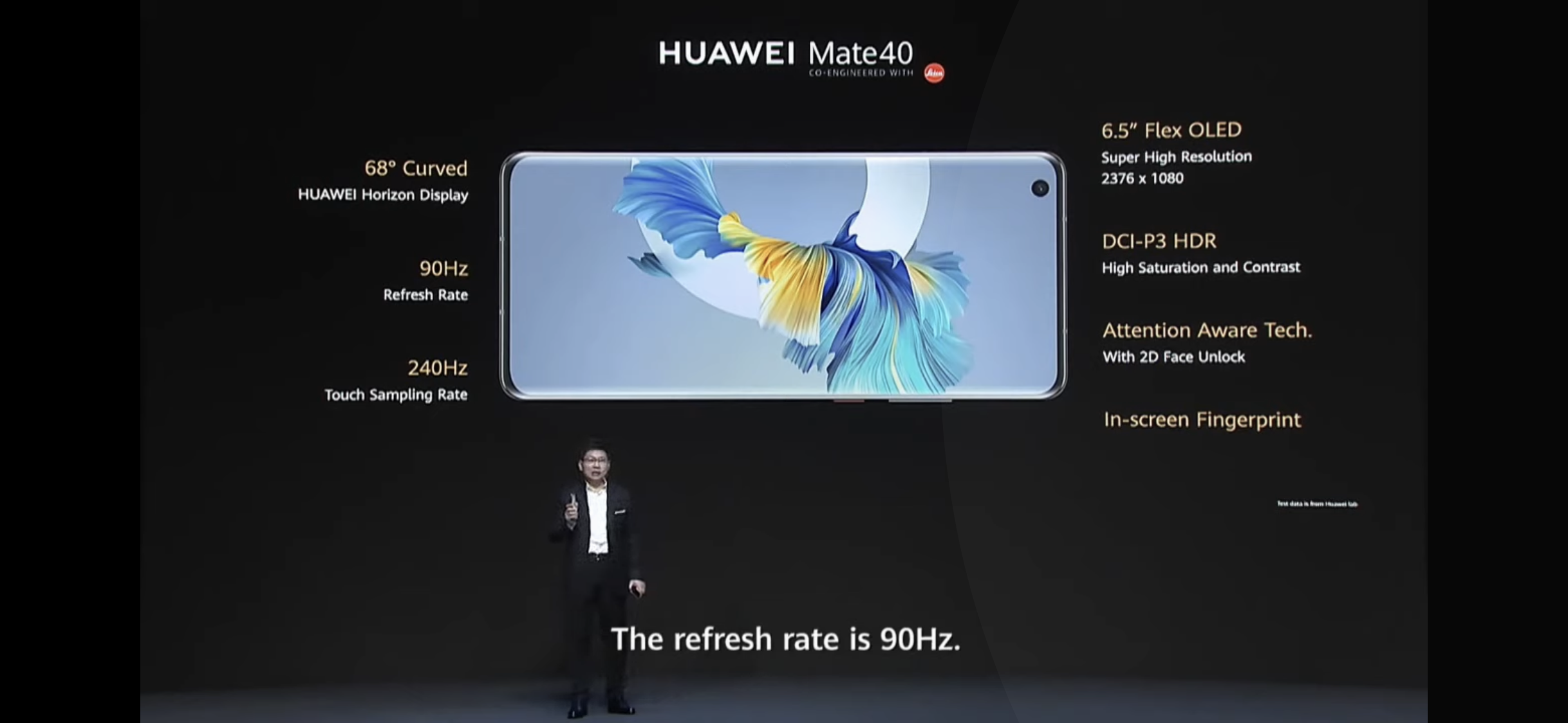 기본형인 메이트 40에 대한 얘기도 했는데 6.5인치 OLED 디스플레이로 메이트 40 프로 시리즈처럼 양쪽 끝에 엣지 처리를 했고 68도의 곡면 각도를 지닌다고 한다. 90Hz의 주사율과 240Hz의 터치 인식 주사율은 프로와 동일하다.