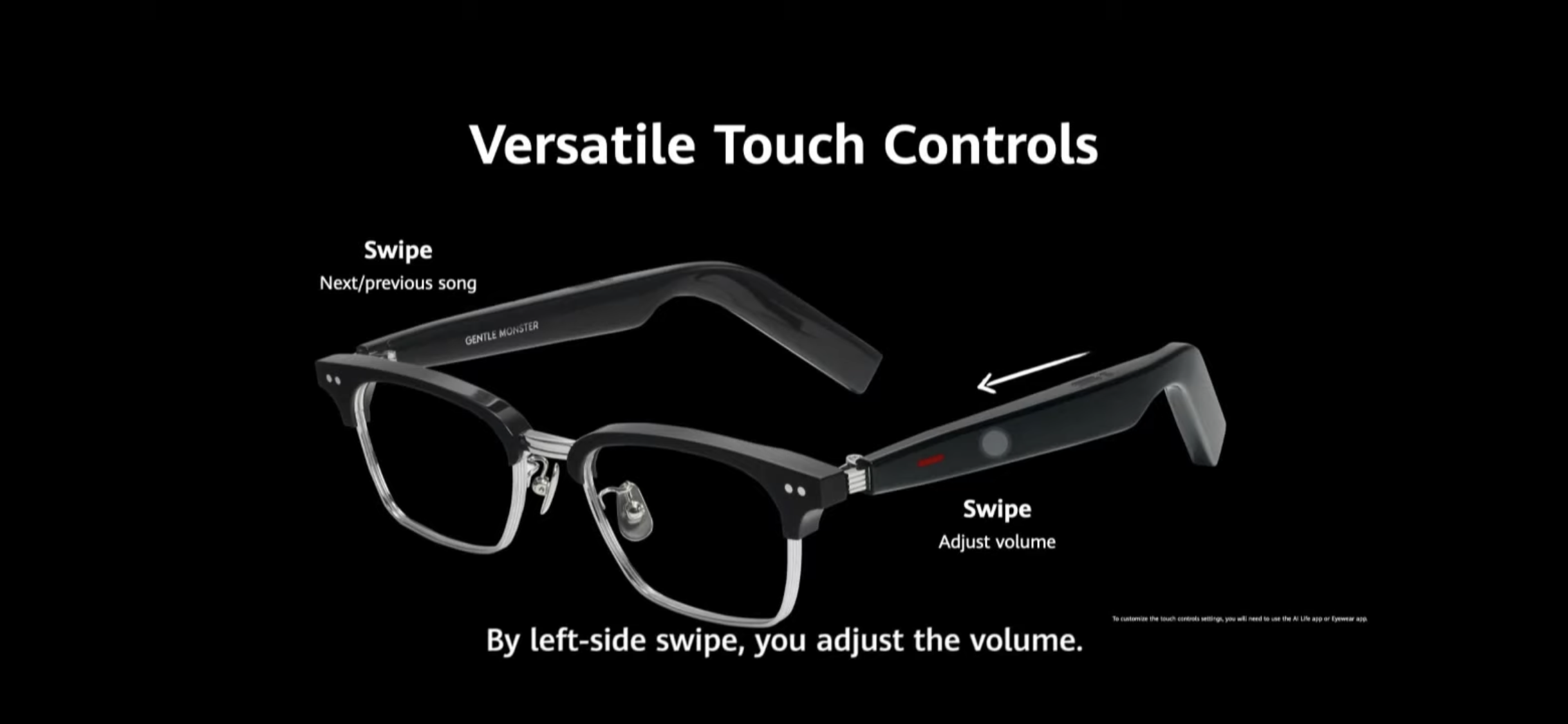 볼륨 조절은 오른쪽 안경테를 스와이핑 하는 것으로 가능하다고 한다. 왼쪽 안경테를 스와이핑하면 곡을 선택하는 기능을 한다고 한다.