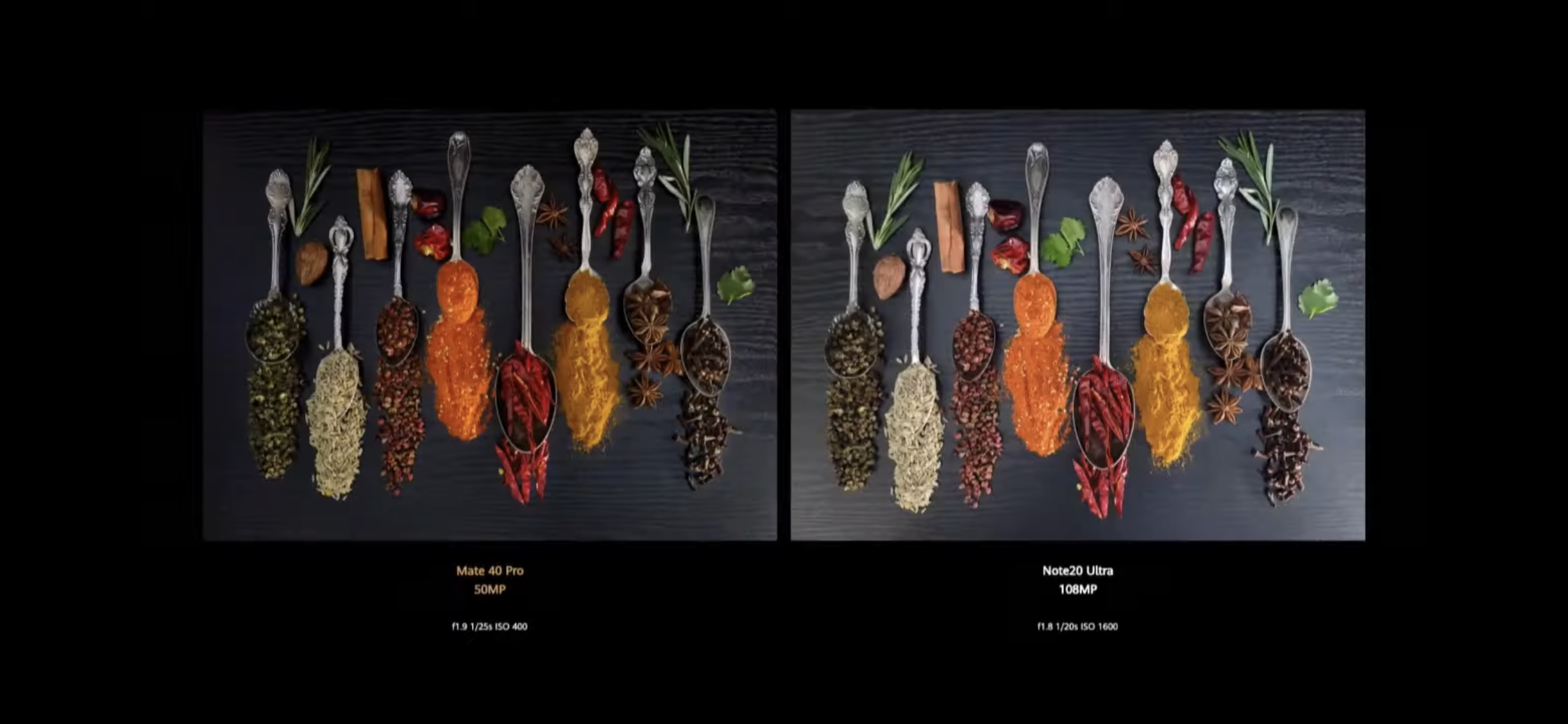 마찬가지로 비교를 했는데 갤럭시 노트 20 울트라의 경우 1/1.33인치, 아이폰12 프로맥스는 1/2.55인치라고 하니 자기네 메이트 40 시리즈에 들어간 1/1.28인치 센서가 얼마나 큰지 자랑할만 하다.