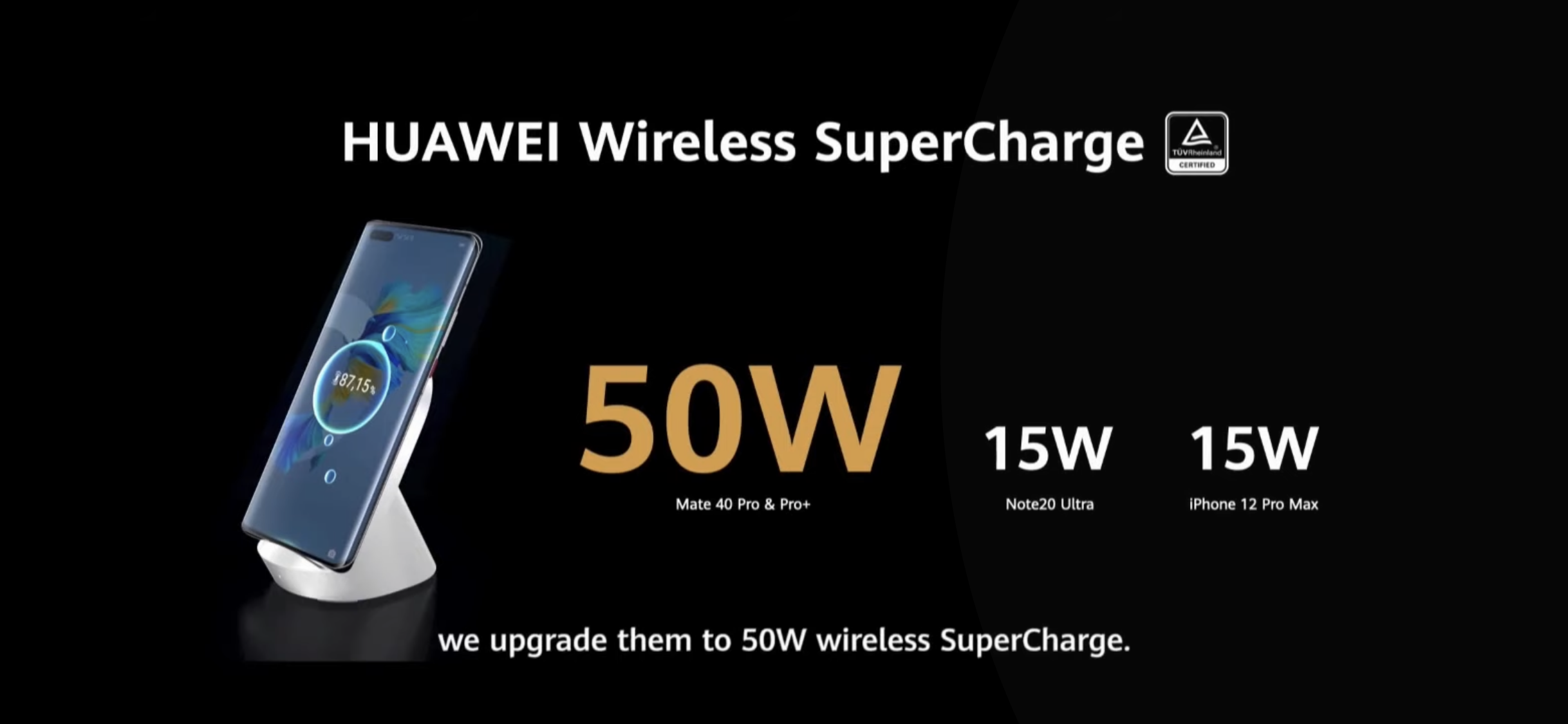 무선 충전 역시 엄청난데 메이트 40 프로 시리즈의 경우 50W의 고속 무선 충전을 제공한다고 한다. 갤럭시 노트 20 울트라와 아이폰12 프로맥스의 경우 15W 고속 무선 충전을 제공한다. 아이폰12 프로맥스의 경우 맥세이프 충전기를 통해서나 15W를 쓸 수 있고 일반 고속 무선 충전의 경우 7.5W를 제공한다.