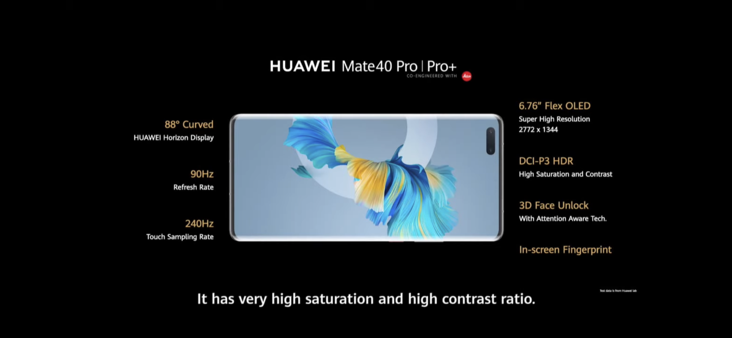 메이트 40 프로 시리즈는 기본적으로 6.76인치 OLED 디스플레이로 양쪽 끝을 둥그스름하게 엣지 모양으로 처리했다. 엣지의 커브 각도가 무려 88도나 된다. 화면 주사율 역시 90Hz며 터치 인식 주사율은 240Hz로 빠른 반응을 제공한다.