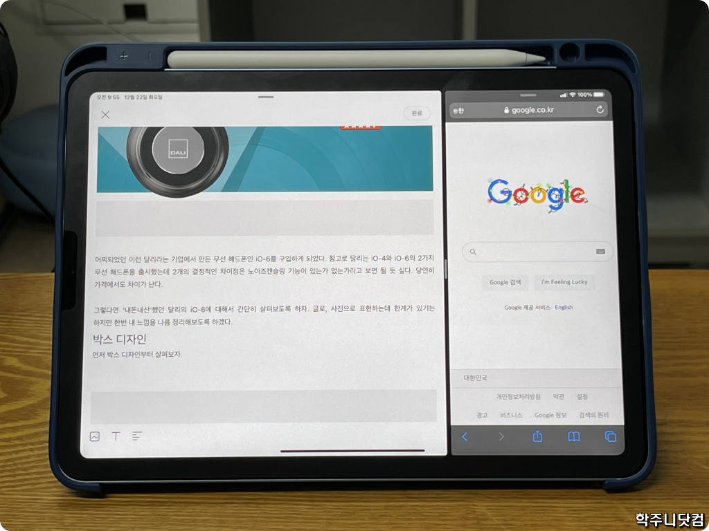 이 학주니닷컴은 티스토리 블로그인데 티스토리 앱이 아이패드용으로도 있어서 그것을 이용하기도 하고 아니면 크롬 웹브라우저나 사파리 웹브라우저를 이용하여 포스팅 작업을 진행하는데 큰 불편은 없다. 위의 사진에는 블로그 포스팅에 들어갈 내용의 세부 내용을 살펴보기 위한 미니 웹브라우저를 띄워뒀지만 가끔은 앞서 소개한 에버노트에 적은 블로그 포스팅 주제 및 정리 내용을 띄워두고 작업하기도 한다.