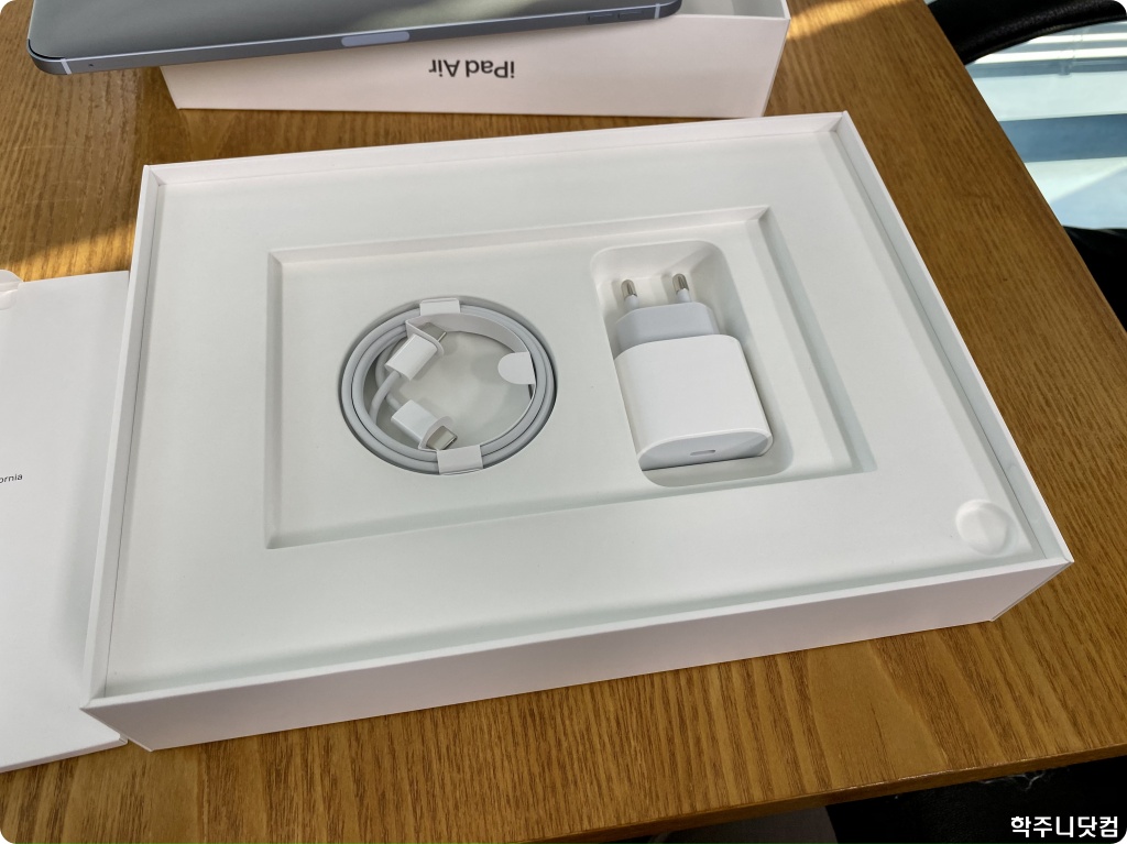 봉투를 걷어내면 그 밑에 USB-C 타입 충전 케이블과 충전기가 들어있다. 환경을 사랑하는 애플이 에어 4에는 충전기를 넣어줬다. 참고로 환경을 사랑하는 애플이 충전기를 제거해서 제공하기 시작한 것은 애플 워치 시리즈 6부터이다. 에어 4와 애플 워치 시리즈 6은 같은 애플 이벤트에서 발표가 되었는데 에어 4에는 넣어주고 애플 워치 6에는 뺐다는 것이 좀 웃기다.