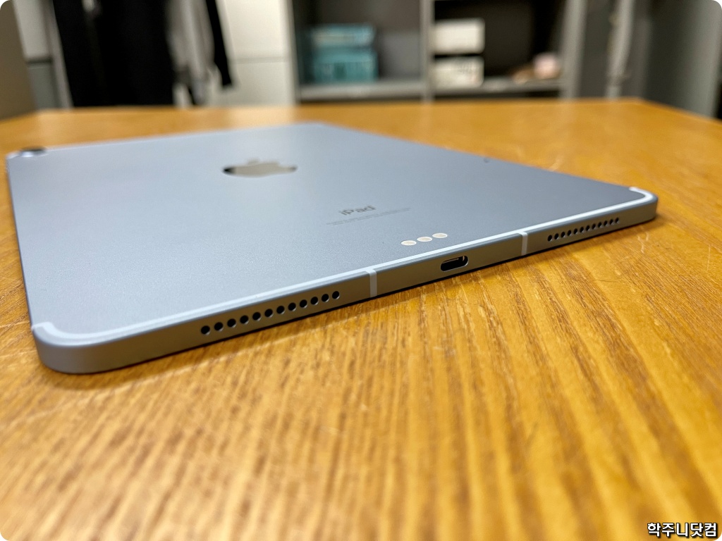 에어 4의 뒷면 모습인데 위에서 봤을 때에는 스카이블루 색상이 잘 보였는데 밤에, 어두운 곳에서 봤을 떄에는 스카이블루가 아닌 스페이스그레이 색상에 가깝게 보이는 것이 좀 아쉽다.