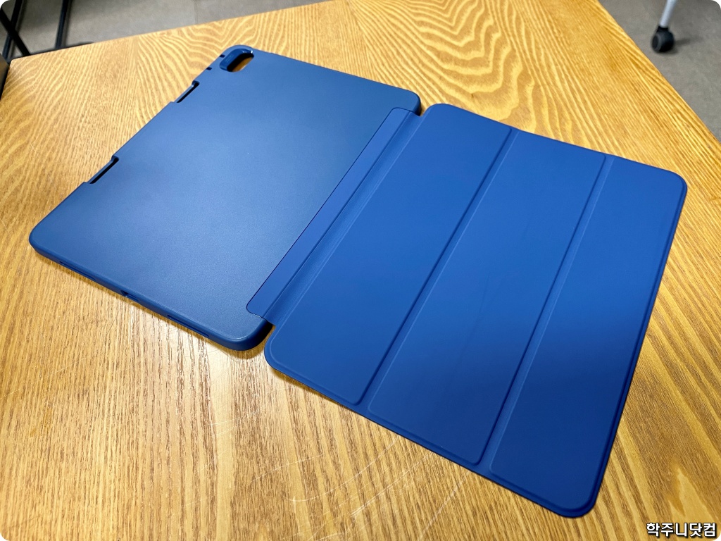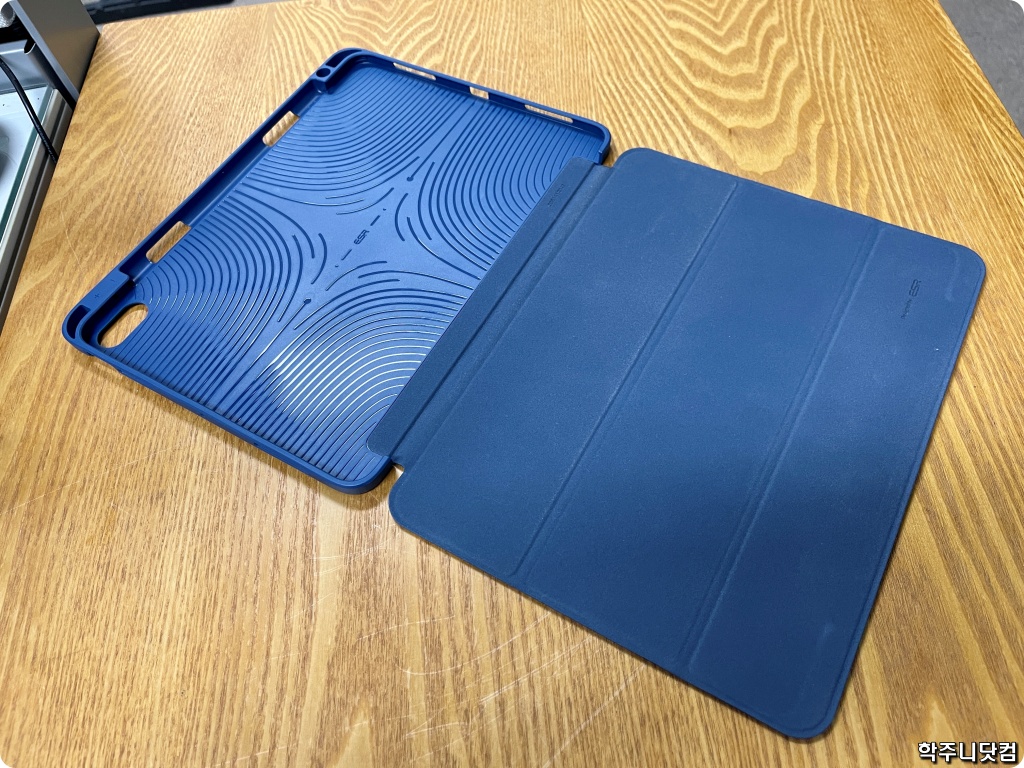 비록 내가 원하는 디자인의 케이스는 아니지만 그래도 뭐 쓰는 데는 별 문제가 없는 에어 4 케이스다. 이 케이스의 특징은 스마트 케이스 모양을 하면서도 애플 팬슬을 함께 수납, 보관할 수 있게 되어 있다는 점이다.