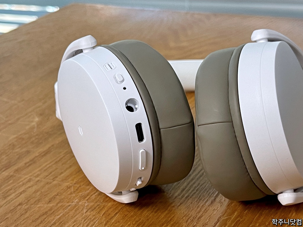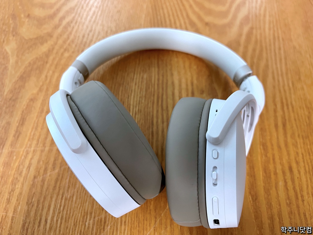 일단 이어컵 부분은 좌우로 잘 움직이고 밑에서 언급하겠지만 휴대용으로 잘 수납할 수 있도록 접히는 구조로 되어 있기 때문에 경첩 부분이 보이는 것이 특징이다.