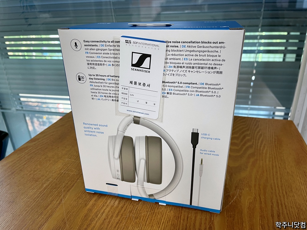 박스 뒷면에는 HD450BT의 간단한 특징이 적혀있는데 이게 웃기는 것이 난 한국에서 정발된 제품을 샀는데 설명은 영어, 중국어, 일본어, 독일어, 스페인어 등으로는 적혀있는데 한글은 없다는 것이다. 한국 정발 제품에는 박스 설명도 좀 한글로 적어주면 안되나? 그 부분은 좀 아쉬웠다.
