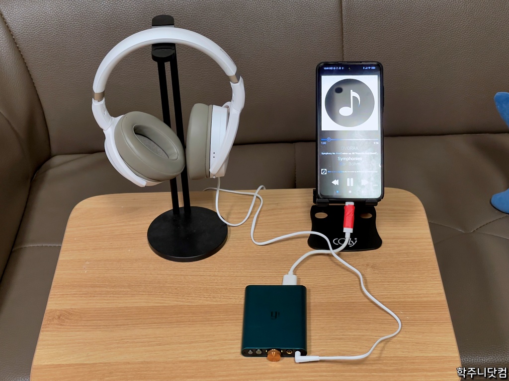 내가 주로 듣는 방식은 위의 방식처럼 듣는다. 무선이 아닌 유선을 연결해서 듣는데 유선으로 직접 스마트폰에 연결하는 것이 아닌 중간에 DAC를 둬서 스마트폰에서 DAC를 거쳐서 HD450BT로 들어갈 수 있게 연결한 다음에 듣는다. 이러면 확실히 무선으로 그냥 들을 때보다 훨씬 사운드의 퀄리티가 다른 듯 싶다.