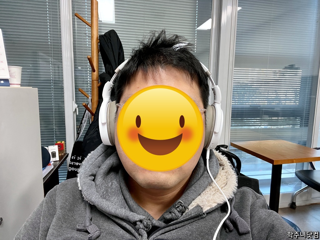 착용했을 때는 위와 같은 모습이 된다. 이 글을 보는 분들의 시력 보호(?)를 위해 얼굴은 가렸다(ㅋㅋ). 무선으로도 쓸 수 있지만 내 경우 유선으로 쓸려고 샀기 때문에 유선 연결된 모습을 보여준다.
