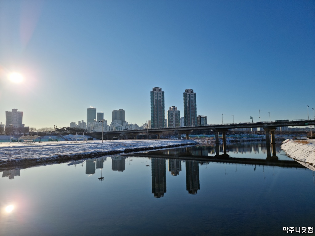 앞서 신도림을 바라본 사진처럼 위의 사진에서도 쩅한 느낌은 잘 드러나는 듯 싶다. 하늘과 물의 색상도 짙게 표현되는 것 같고..