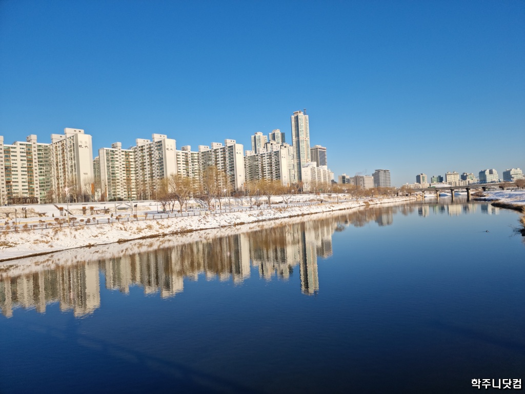 위의 사진은 마찬가지로 내가 자주 출퇴근하는 경로인 안양천의 신정잠수교에서 바라 본 아침의 목동의 모습이다. 위의 사진은 1억 800만 화소로 찍은 사진인데 포토스케이프로 축소한 것이라는 것을 참고하길 바란다.