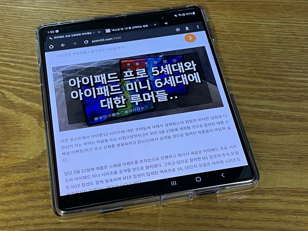 개인적으로 폴더블 스마트폰이 생기면 꼭 한번 세팅해보고 싶은 방식이었다. 지금은 스마트폰(아이폰12프로맥스)과 태블릿(아이패드 에어 4)을 따로 들고 다니면서 사용하고 있는데 저렇게 갖고 다닌다면 키보드와 마우스를 잘만 수납할 수 있는 방법만 찾는다면 스마트폰과 태블릿을 따로 안갖고 다녀도 될 수 있는 상황을 만들 수 있기에 말이지.