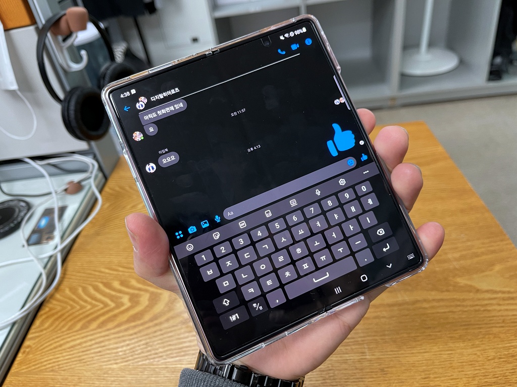 폴드2는 스마트폰과 태블릿이 같이 공존하는, 함께 있는 폼팩터라고 보여진다. 뭐 어찌되었던 별도의 키보드는 없으니까 당연히 터치 키패드로 입력을 한다. 커버 디스플레이와 메인 디스플레이에서의 키패드 모양이 어떤지 보자.