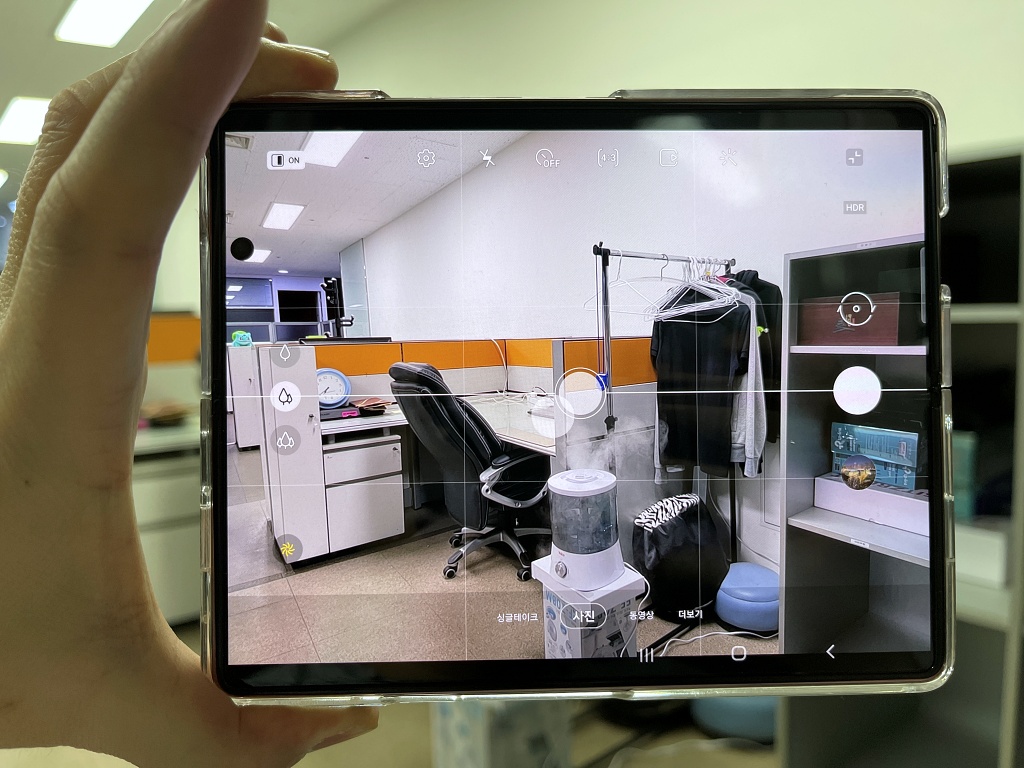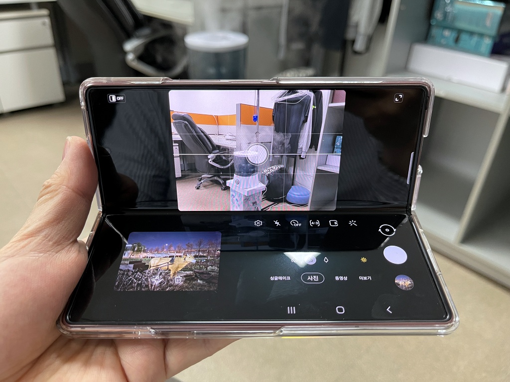 그런데 보통은 저렇게 펼쳐서 찍기보다는 접은 상태에서 카메라를 쓰는 경우가 더 많을 듯 싶다. 접었을 때의 카메라 기능은 일반 스마트폰의 카메라 기능과 동일하기 때문에 따로 정리하지는 않겠다.