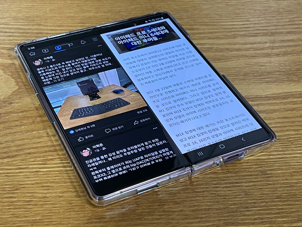 여하튼 내 경우에는 지금도 스마트폰과 태블릿을 함께 갖고 다니고 있는데 폴드2는 이런 2개를 갖고 다니는 귀찮음을 하나로 해결할 수 있다는 장점이 크게 보였다. 블투 키보드와 마우스 조합으로 태블릿 사용 커버가 가능하고 말이다. 수납 문제만 잘 해결하면 가방을 안들고 다니면서 태블릿 사용이 가능할 수 있겠다는 생각이 들었다.