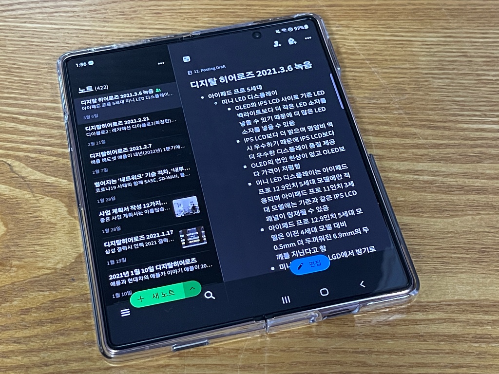 에버노트와 같은 노트 앱들은 아무래도 작은, 혹은 좁은 화면보다는 크고 넓은 화면이 유리하다. 그런 의미에서 폴드2와 에버노트의 조합은 내가 생각하기에 꽤 괜찮았다.