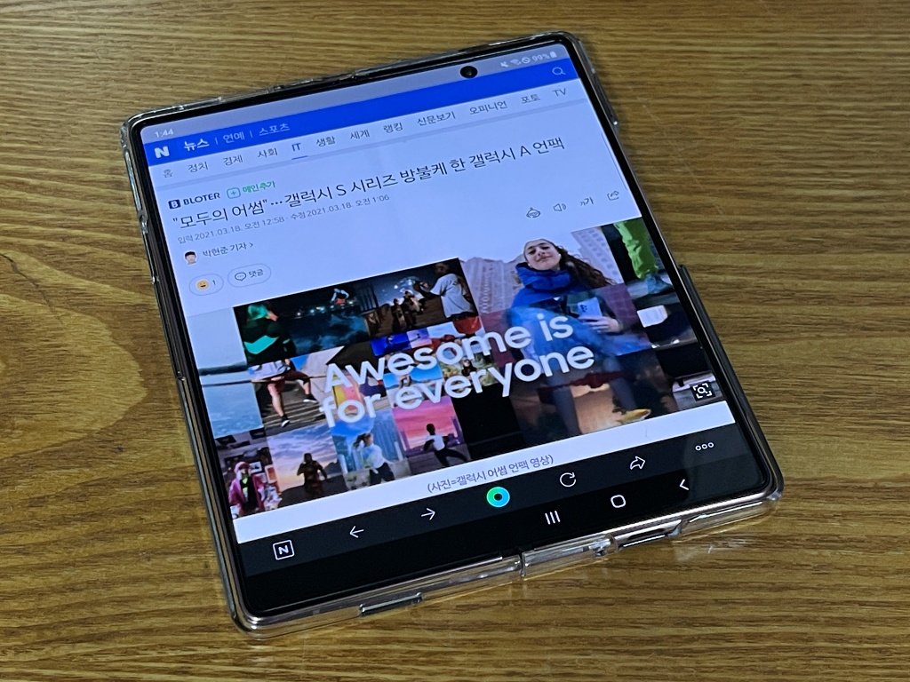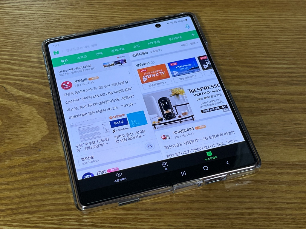 앞서 커버 디스플레이에서는 웹브라우저에 대해서 언급했지만 메인 디스플레이에서는 콕 찝어서 네이버 앱을 실행해봤다. 네이버 앱은 스마트폰 모드와 태블릿 모드가 나뉘어져 있는데 커버 디스플레이에서는 스마트폰 모드로, 메인 디스플레이에서는 태블릿 모드로 넓은 화면에 맞춰서 컨텐츠 배치를 보여준다.
