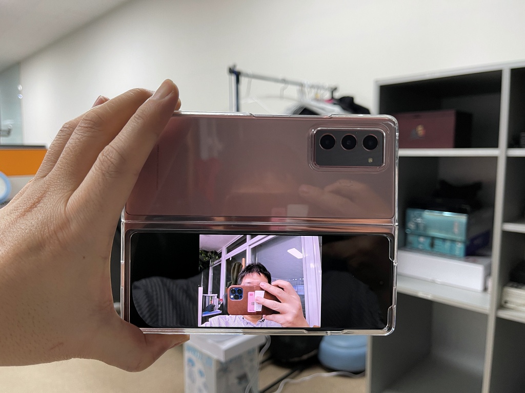 하지만 펼쳤을 때 오히려 더 괜찮게 찍는 방법은 위와 같이 메인 카메라로 셀카를 찍는 방법이 아닐까 싶다. 펼쳤을 때의 후면에는 카메라와 동시에 커버 디스플레이도 같이 보이기 때문에 카메라에 비춰진 모습이 커버 디스플레이에 되어서 확인이 가능하다.