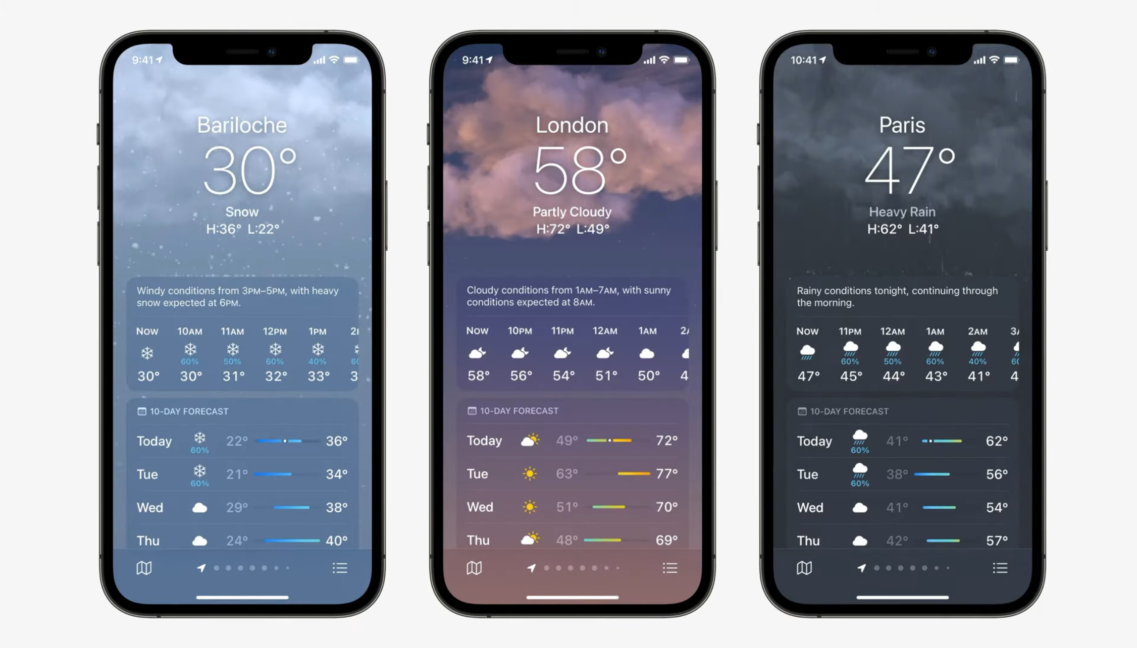 날씨 앱 역시 변경되었는데 해당 날씨에 따라서 앱 배경이 날씨에 맞는 배경으로 변경되는 기능이 개선되었다. 날씨에 따라서 앱 배경이 바뀌는 것은 이전 iOS의 날씨 앱에서도 지원되는 기능이었지만 애니메이션 기능 등이 추가되어 디자인이 새롭게 변경되었다고 한다.