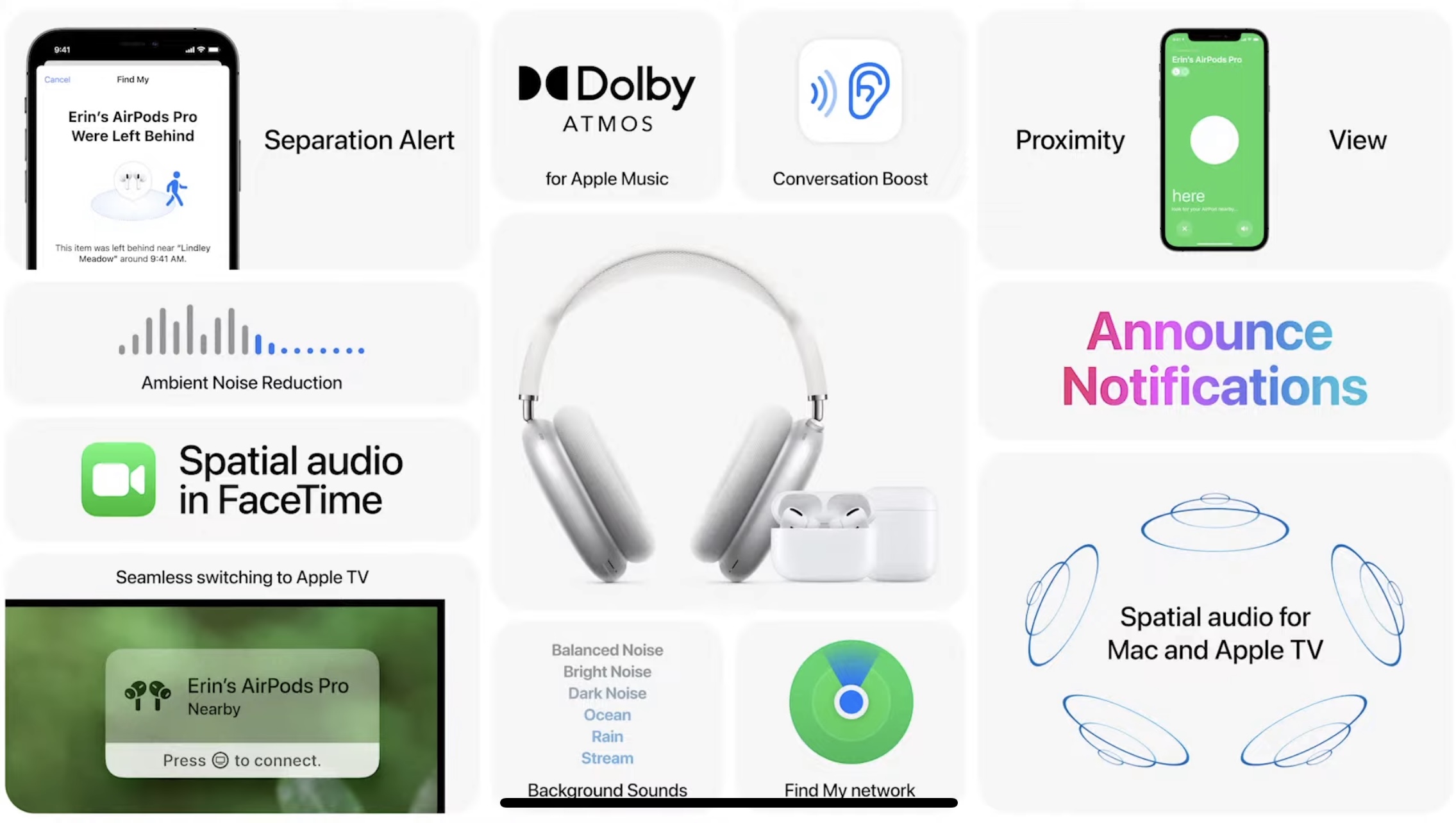 대화 부스트(Conversation Boost) 기능이 추가되었는데 컴퓨테이셔널 오디오 기능과 빔 포밍 마이크를 통해서 목소리를 좀 더 확실하게 들려주는 기능이다. 에어팟에 보청기 기능이 강화되었다고 보면 된다. 얼굴을 맞대고 있는 사람의 목소리를 더 또렷하게 들려주고 주변 잡음을 제거하는 노이즈캔슬링 기능이 추가되었다.