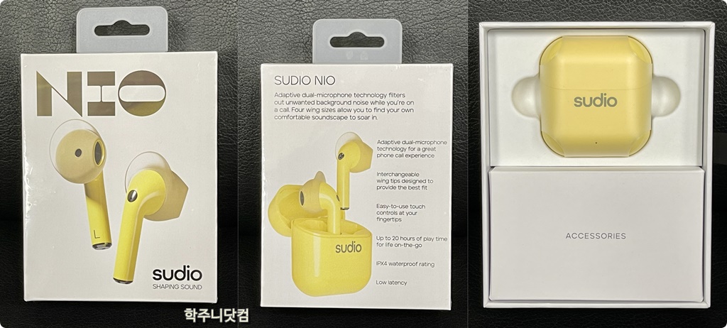 박스 뒤에는 간단한 수디오 니오의 성능에 대해서 언급을 했는데 자세한 내용은 밑에서 다루도록 하고 박스를 열면 수디오 니오 레몬의 이어버드가 들어있는 충전 케이스와 함께 악세서리라고 쓰여있는 박스가 있다. 자세한 구성품 내용은 밑에서 설명하도록 한다.