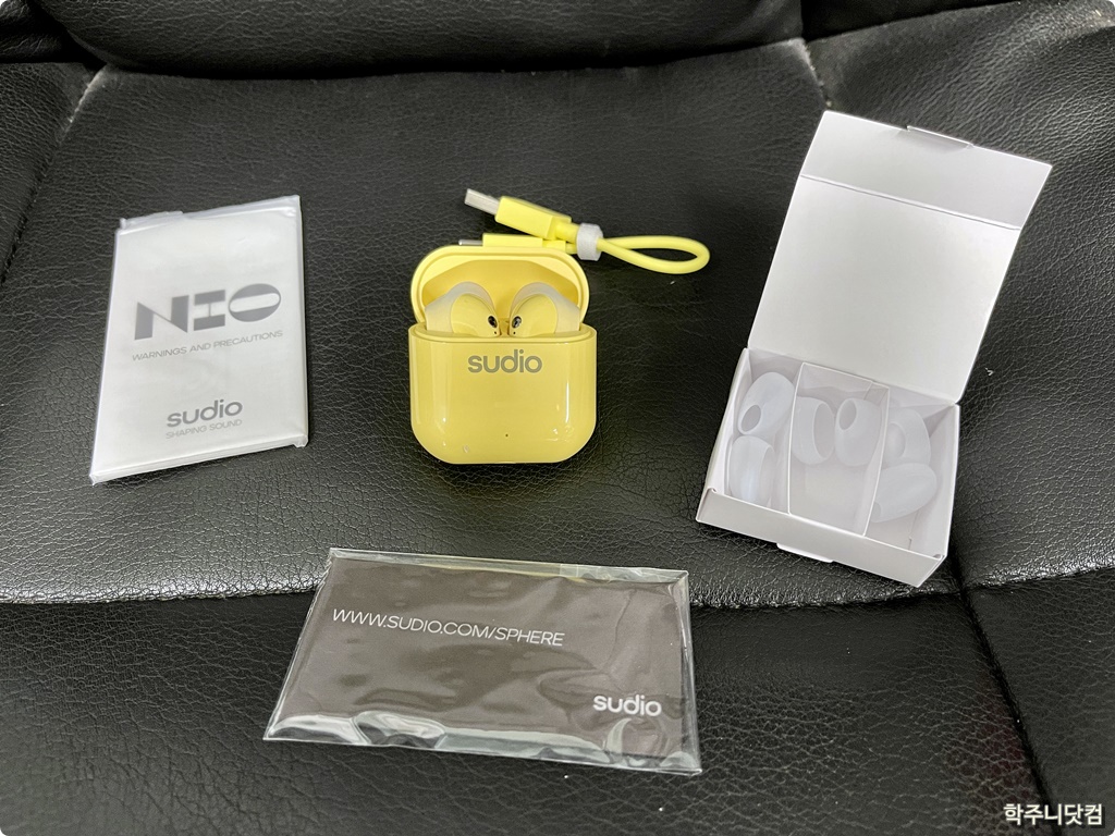 니오 레몬 박스에서 악세서리 박스 안에 있는 내용까지 모두 꺼내보면 위와 같다. 수디오 니오 레몬 이어버드가 있는 충전 케이스와 충전 케이블(USB-C 타입), 설명서와 여분의 윙팁, 그리고 천을 하나 주는데 충전 케이스와 이어버드를 닦는 용도인 듯 싶다.