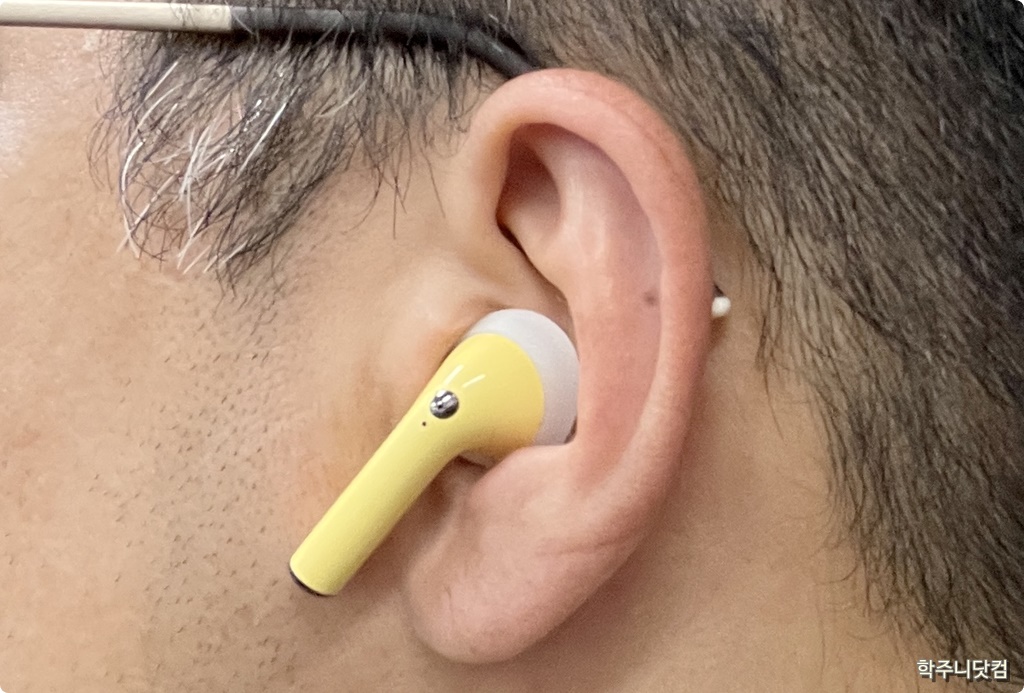 윙팁이 있으면 귀에 저렇게 걸쳐셔 있어도 윙팁의 실리콘 재질이 마찰력을 만들어서 잘 안빠지게 만들어준다. 아무래도 윙팁이 없으면 좀 잘 빠질 것 같은 불안감이 생길 듯 싶기도 하고 말이다. 그래서 윙팁은 어떤 의미에서 거의 필수적으로 끼우는 것이 맞을 듯 싶다.