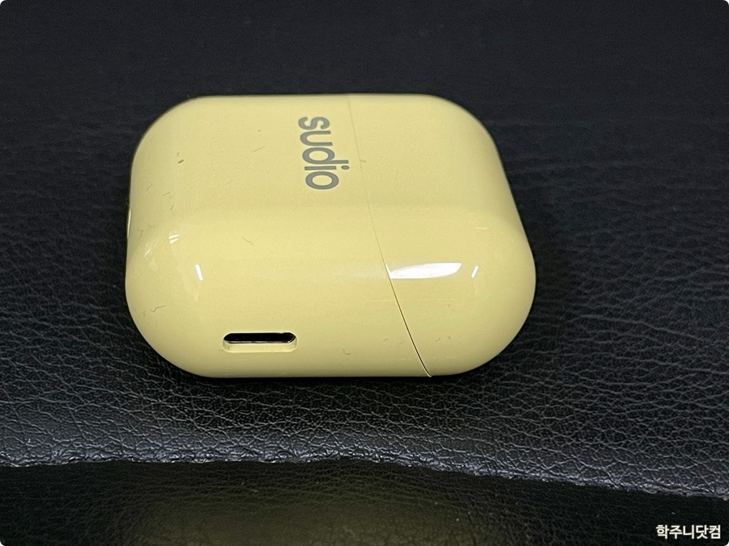 위의 구성품 사진에서 보면 알 수 있듯 충전 케이스에 뚜껑을 열고 이어버드를 끼우는 방식이다. 이 방식은 애플의 에어팟 케이스와 비슷한데(이전 포스팅에서도 그런 얘기를 적었다) 색상이 레몬색이라서 조금은 독특한 느낌을 준다. 충전 케이스 전면에 sudio 로고도 잘 찍혀있고 말이지.