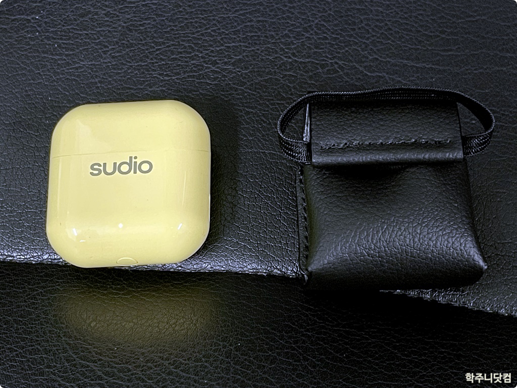 위의 구성품 사진에서 보면 알 수 있듯 충전 케이스에 뚜껑을 열고 이어버드를 끼우는 방식이다. 이 방식은 애플의 에어팟 케이스와 비슷한데(이전 포스팅에서도 그런 얘기를 적었다) 색상이 레몬색이라서 조금은 독특한 느낌을 준다. 충전 케이스 전면에 sudio 로고도 잘 찍혀있고 말이지.