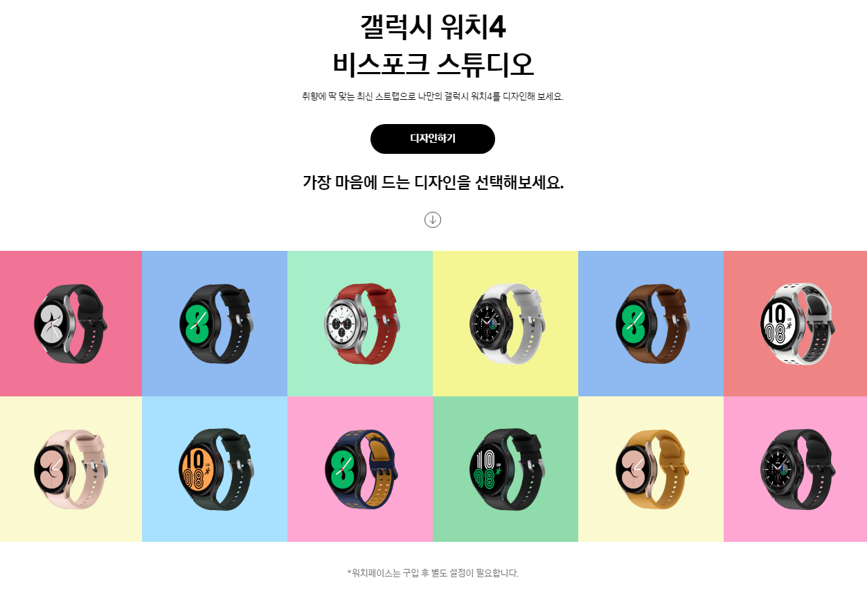 워치4 비스포크 에디션은 플립3 비스포크 에디션과 달리 좀 색상 조합에 가지수가 살짝 적은 듯 싶다. 워치4 비스포크 에디션은 워치4의 바디와 스트랩을 선택해서 맞추는 것이다.