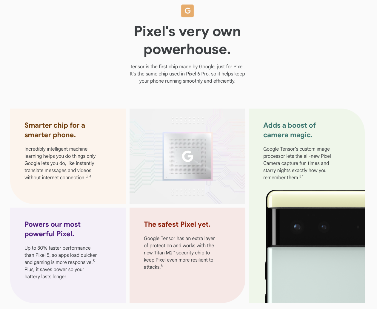 아직 실물을 보지 못했지만 픽셀 이벤트에서 공개된 내용과 구글에서 제공한 내용, 여러 사이트에서 언급한 내용을 보면 픽셀 6 시리즈의 상당수 기능들은 모두 구글 텐서 칩셋의 성능에 전적으로 의존하는 경우가 많다. 워낙 강력한 성능을 제공하면서도 인공지능 성능이 뛰어나니 카메라부터 시작해서 다수의 기능을 대부분 커버해줄 수 있기 때문이다.