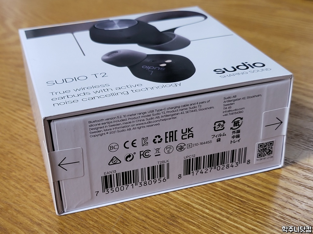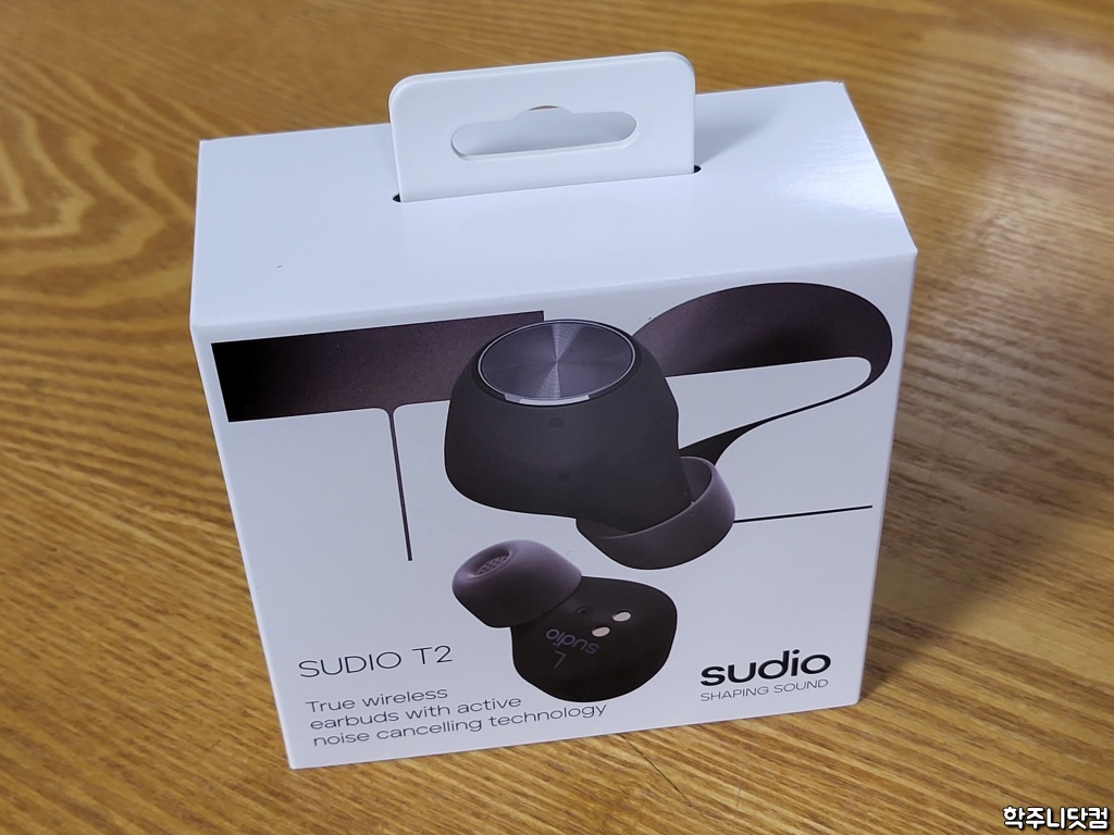 수디오 제품, 특히 TWS 제품의 박스 디자인은 심플하면서도 뭔가 엣지가 있는 느낌이 든다. 박스 전면에 T2의 이어버드 모양이 새겨져 있으며 액티브 노이즈 캔슬링 기술을 탑재했다고 언급되어 있다. 이 부분은 밑에서 자세히 다루기로 한다.