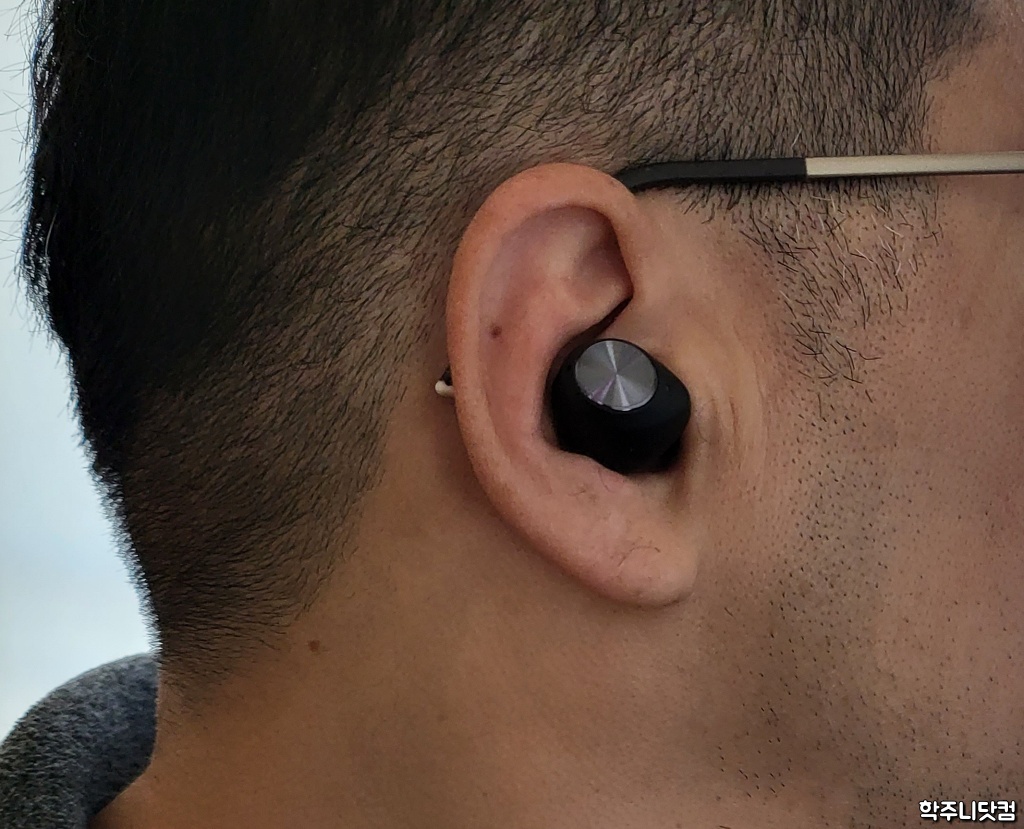 위의 모습은 T2 이어버드를 귀에 착용했을 때의 모습이다. 이왕이면 괜찮은 모델로 착용샷을 했어야 했는데 마땅한 모델이 없어서 본인 등판을 했다(-.-). 이어버드를 귀에 넣은 뒤 돌려서 귀 안쪽에 잘 고정되도록 착용을 해야 한다. 그런데 요즘 나오고 있는 대부분의 TWS가 비슷한 방식으로 착용을 하기 때문에 어색함은 없었다.