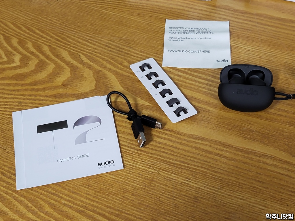 구성품은 간단하다. 수디오 T2 이어버드와 충전 케이스, 그리고 사이즈별 이어팁과 충전 케이블, 사용자 설명서 등이 들어있다. 충전은 USB-C 타입을 사용하며 귓구멍의 크기에 맞는 이어팁을 별도로 챙겨주는 것도 나름 괜찮았다. 참고로 수디오 제품들은 별도의 어플리케이션은 존재하지 않는다.