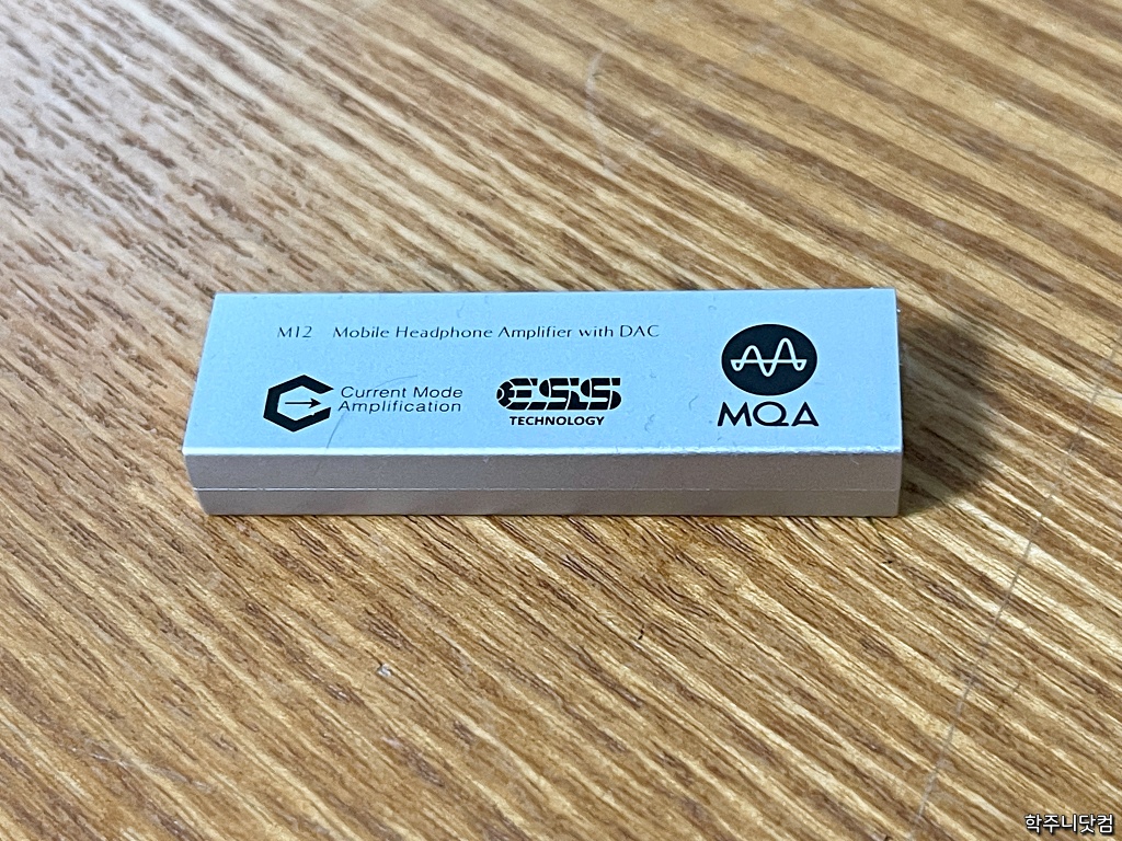 M12라는 모델명 옆에 Mobile Headphone Amplifier with DAC라고 쓰여있는데 대놓고 DAC를 겸하는 모바일 해드폰 앰프라고 적혀있다. 그리고 그 밑에 ESS로고가 있는데 DAC를 위해 ESS 칩셋을 쓰고 있다고 밝히고 있다. MQA 로고도 있는데 MQA 디코딩을 지원한다. 타이달 등으로 들을 때 무손실에 가까운 음원을 들을 수 있다.