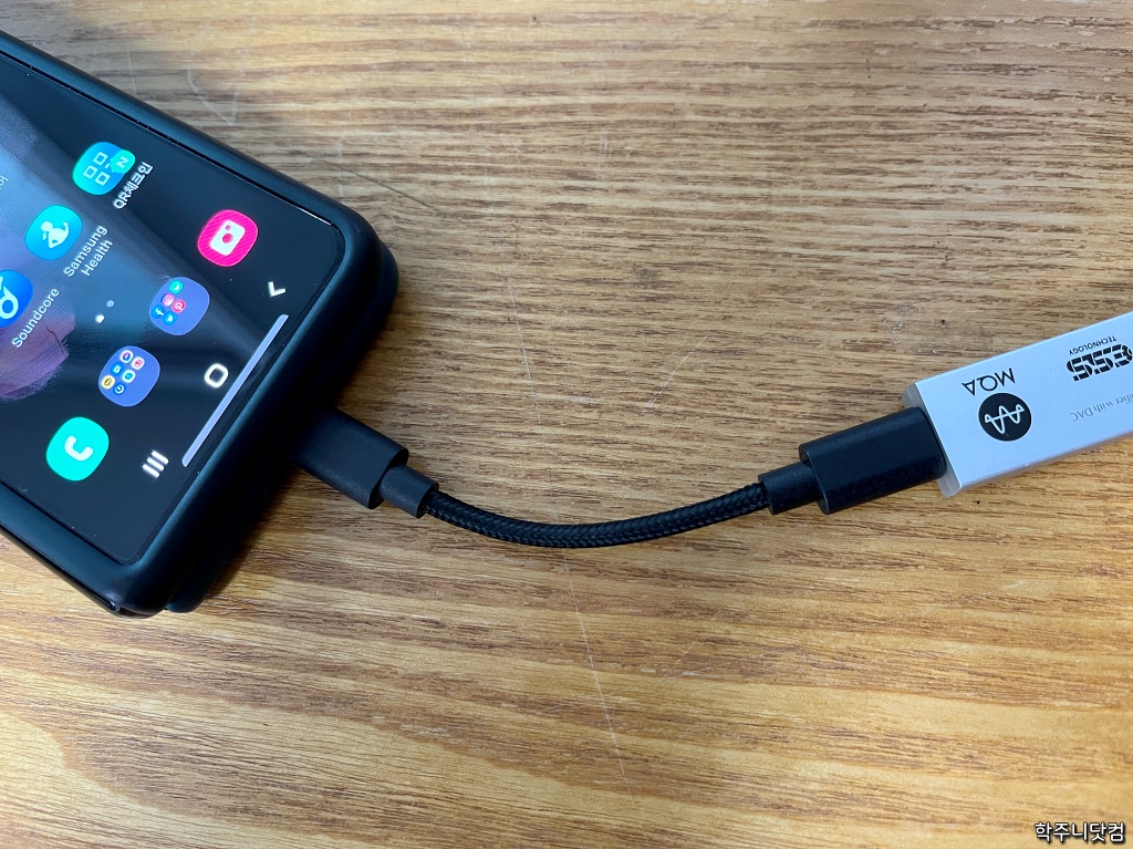 이 글을 쓰는 시점에서 내 메인 스마트폰은 갤럭시Z폴드3로 안드로이드 스마트폰이다. 당연히 USB-C 포트를 지원하기 때문에 함께 동봉되어 있는 USB-C to USB-C 케이블을 M12와 갤럭시Z폴드3에 연결해서 사용한다. 최근 출퇴근때, 혹은 외근 등 외부에 나갈 때 이동할 때 저렇게 연결해서 음악을 듣고 있다.iPhone(라이트닝) 연결