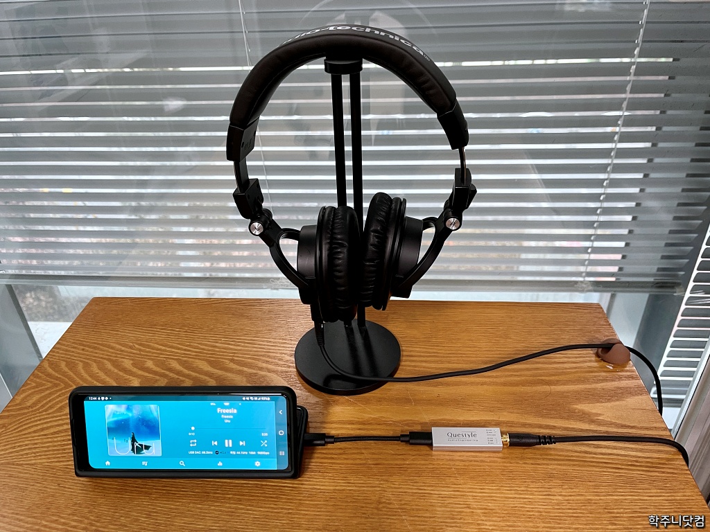 위의 모습은 회사에서 점심 시간이나 저녁 시간에 좀 쉴 때 음악감상을 하곤 하는데 그 때 메인으로 듣는 해드폰으로 오디오테크니카에서 나온 ATH-M50X 해드폰을 연결한 모습이다.